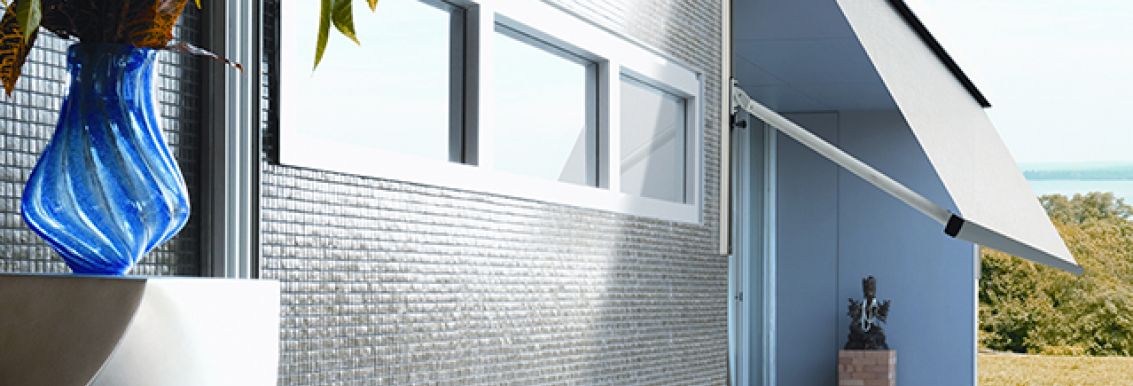 Pivot arm awning – perfect for outward opening windows, to circulate air flow and reduce direct sunlight into the home. The awning arm projects the fabric off the window, with the arms and fabric forming an arc that allows air to flow behind the awning. This allows windows to be open whilst the awning is projected. This system is a heavy duty contemporary design ideal for larger windows.